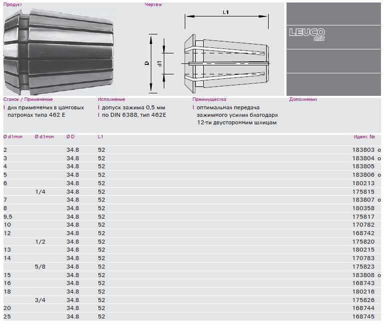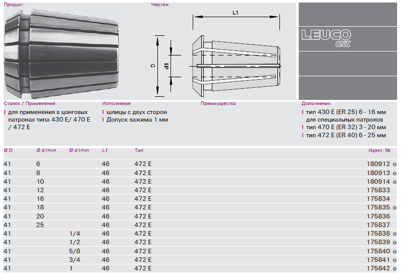 Цанговые патроны Leuco применяются на обрабатывающих центрах с ЧПУ с автоматическим устройством смены инструмента, для прецизионного зажима хвостовых инструментов с цилиндрическим хвостовиком. Универсальное применение благодаря зажимным цангам. Дополнения: